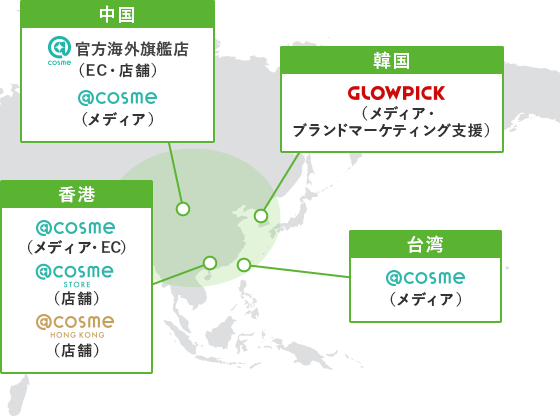@cosmeのメディア・EC・店舗が三位一体となったプラットフォームを、東アジアを中心に各国領域のニーズに合わせカスタマイズしながら展開し、各国・地域で生活者とブランドの出会いの場を提供するため、事業を拡大しています。
