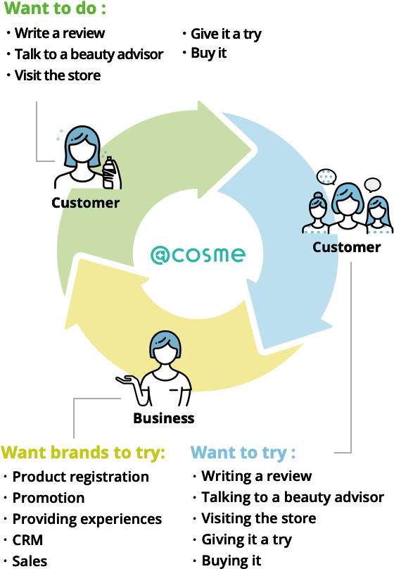 As each business has grown, @cosme has evolved from users seeing @cosme as a review site to users experiencing @cosme as a beauty platform. Moving forward, we are committed to continuously creating new touchpoints between brands and consumers by providing a space for virtuous cycles to emerge naturally, such as when a consumer's desire to share product reviews leads to other consumers' desire to visit stores, which in turn inspires brands on @cosme to hold events and send product information out to consumers.