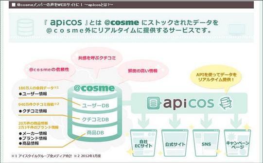 株式会社アイスタイルは、(本社:東京都港区、代表取締役社長 兼 CEO:吉松徹郎)は、この度、日本最大の化粧品・美容総合サイト「@cosme」(アットコスメ)内のストックデータ(ユーザーデータ、クチコミ、商品データ)を、@cosme外部へリアルタイムに提供するWebサービスAPI 「apicos(アピコス)」をリリースしました。