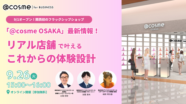 @cosme OSAKAを運営するアイスタイルリテールの担当者が登壇し、"これからの"リアル店舗での体験設計の考え方や、売り場コンテンツ・仕掛けなど新しい店舗の見どころや最新事例をお届けいたします。ぜひご参加ください。